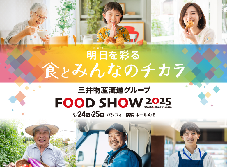 「三井物産流通グループ フードショー」は三井物産流通グループ(株)が開催する食の総合展示会です。出展メーカー約500社の新商品に加え、当社オリジナル商品や食のトレンドが一堂に集結し、全国よりご来場いただく多数の小売業・飲食業様との出会いの場となっております。今回は「明日(みらい)をつくる みんなのチカラ」をテーマに、弊社グループが取り扱う幅広い食品カテゴリーから、魅力ある提案をお届け致します。